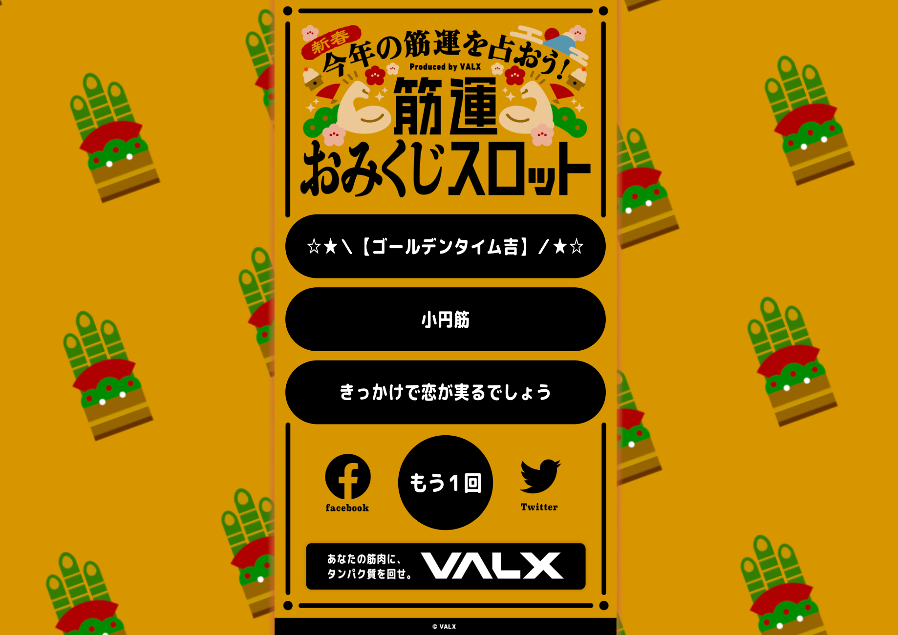 筋運おみくじスロットでは「ムキム吉」「筋肥大吉」等、トレーニングに関する独特な文言を使用しており、1000回に1回、「VALX」を監修するあの筋トレ界のレジェンドが登場するサプライズ仕様になっているそう。