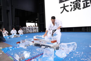 さらに、渡邊五段と無差別級組手世界チャンピオン・入来建武四段による組手が披露され、特別演武のラストに入来四段が豪快な氷柱割りを決めると、観客から大歓声が上がった。