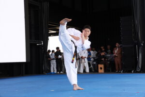 続いては緑代表、組手と型の世界チャンピオン、若手トップクラスの選手による特別演武が披露された。組手の中で見せる力強い突き、華麗な蹴り技は観客を大いに魅了した。