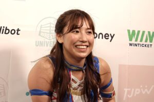 代表コメント後にあらためて話を聞くと「楽しかったですけど、疲れましたね…体力を戻すことはあきらめて、そのままいきました。技に関しては、スキを見つけて出していくしかないので。私はブーツをよく使うんですが、割と距離が離れていても決まるので、こういうとき(変則ルール)でも役立つなと思いました。(初シングルで、得意技の)Finallyは決められなかったのが悔しいですけど、先輩のパーソナルクイズに答えて勝ったので失礼はしていないです!(笑) 最近も(前回のインタビュー時に話した)チキンをしっかり食べて体調管理しています。あ、でもお米を炊くのを失敗したんですよ(笑)。水を入れ忘れて、温かい生のお米ができ上がるという…」