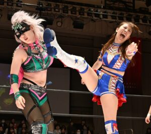 豪快なビッグブーツを決める荒井優希(右)(©東京女子プロレス)