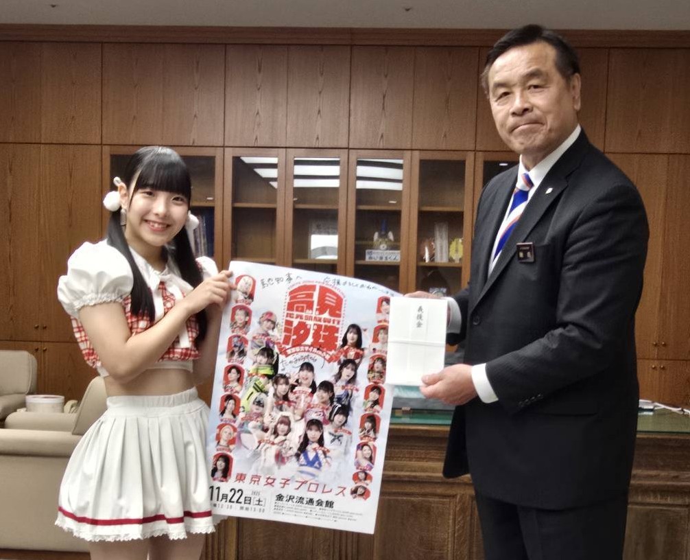凱旋興行に先立ちプロレスラーで石川県知事の馳浩への表敬訪問も実現。石川県を元気に、そして石川県からニッポンを元気に! 凱旋興行でも高見汐珠の元気な叫び声からリングから響きわたることは間違いない。