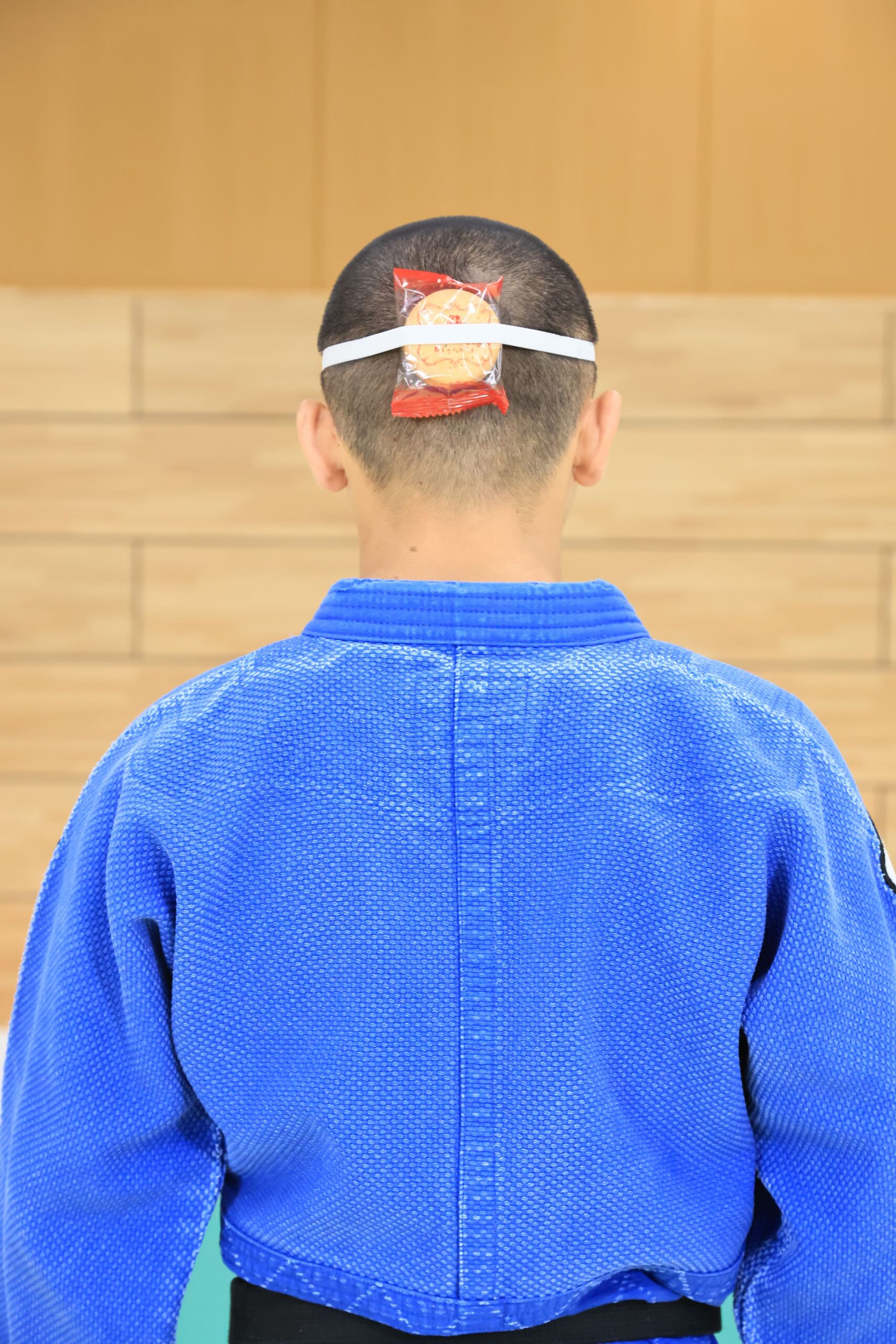 ・クッキーを頭につけて、受身の稽古を行なう。