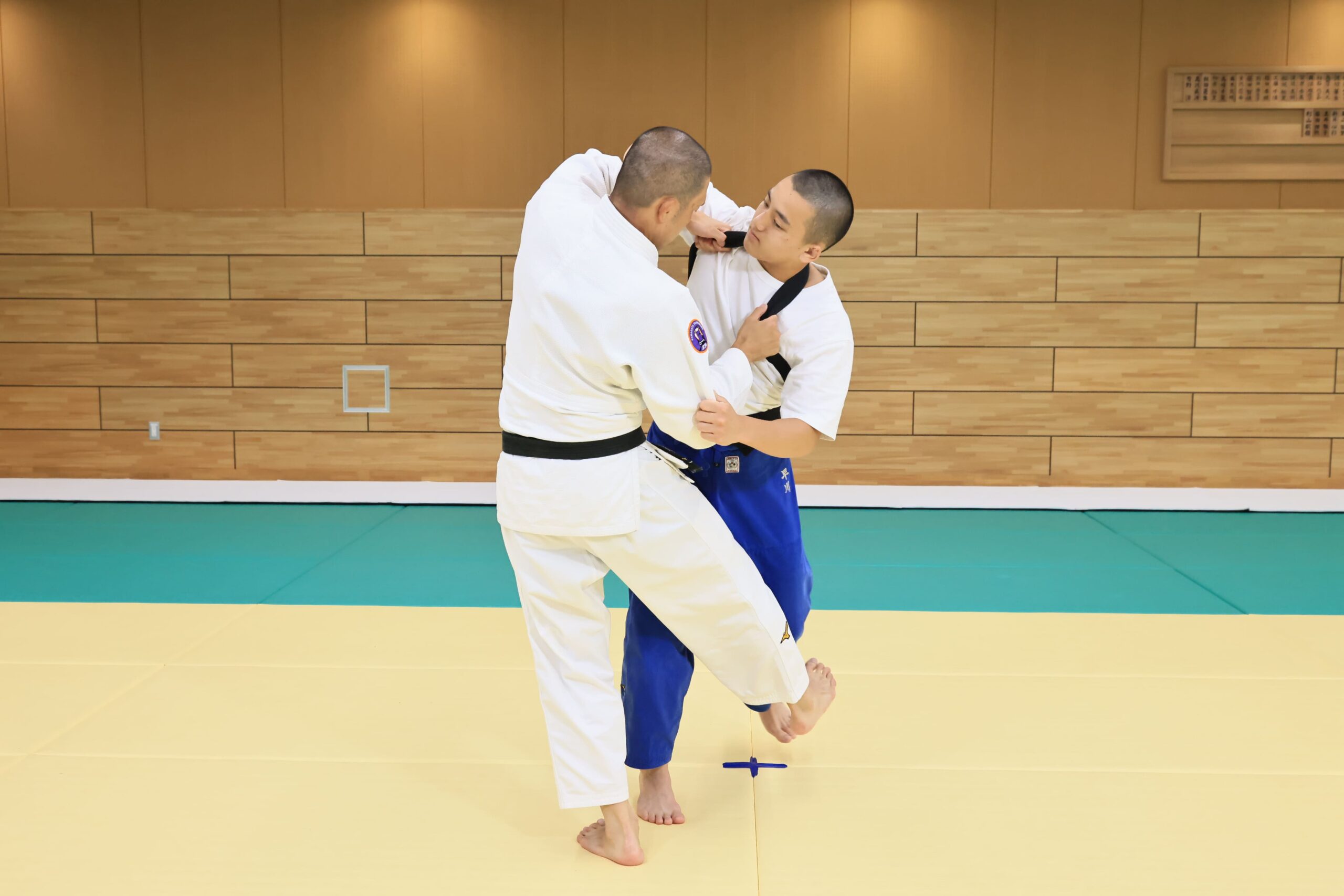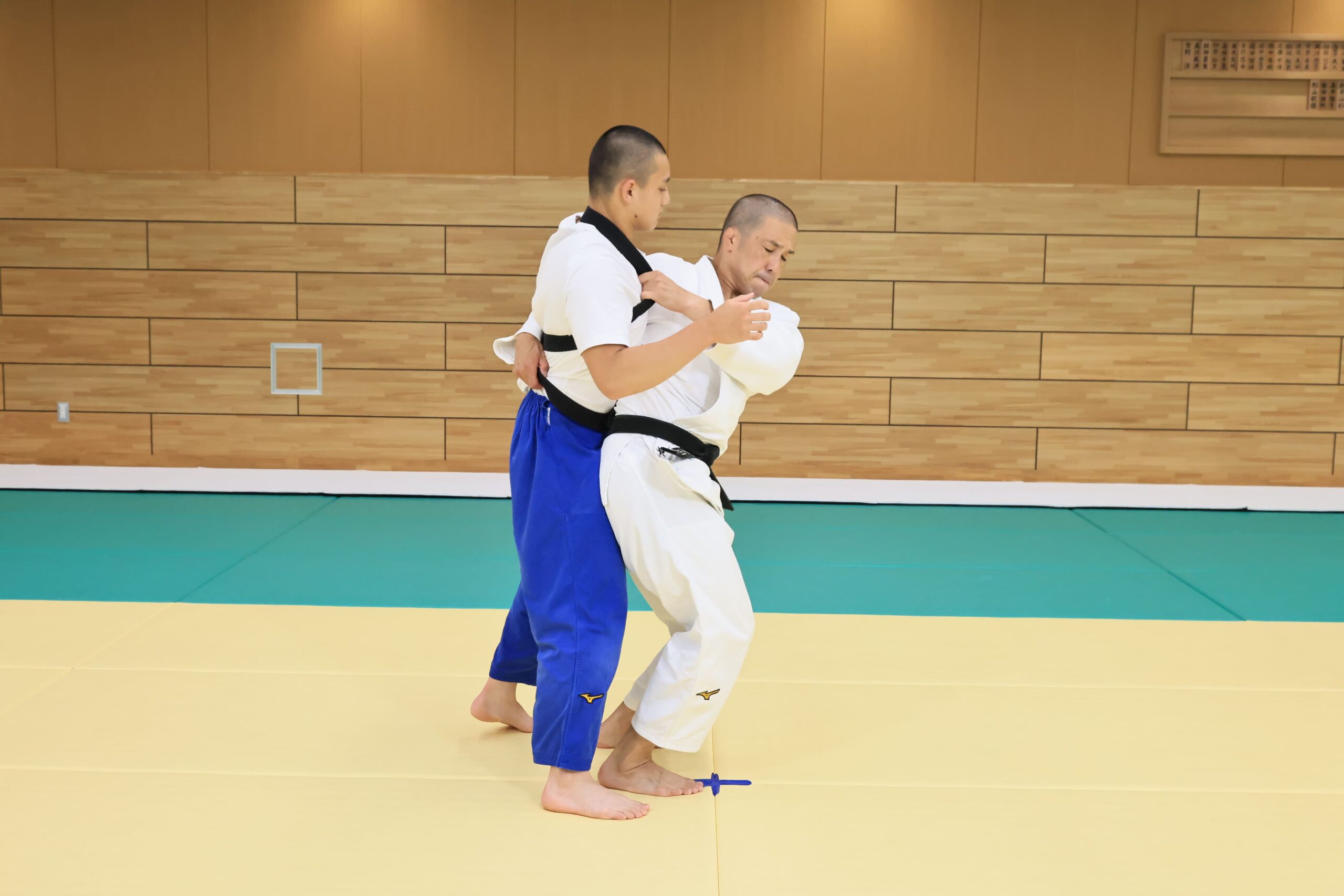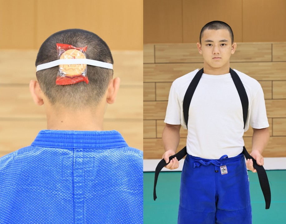 ・道着なしで、ひも(柔道の帯など)を上半身にタスキ掛けし、投げ技に取り組む。