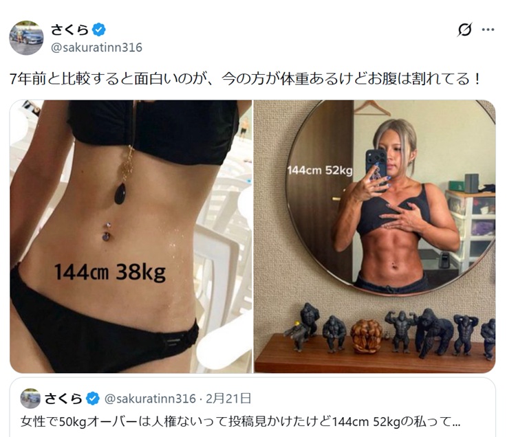 そんな彼女が自身のXを更新。かつての自分とのビフォーアフターを公開した。投稿でさくらさんは「7年前と比較すると面白いのが、今の方が体重あるけどお腹は割れてる!」とコメント。細い時代のさくらさんと、筋肉隆々に変身した現在のギャップが際立った。