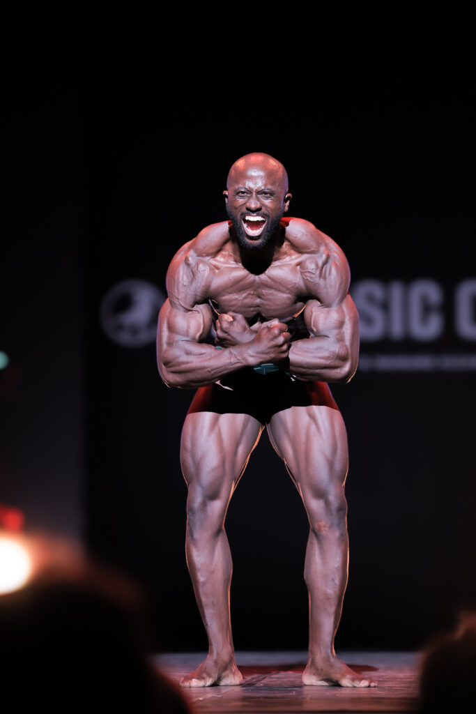初ボディビルとは思えない強烈な姿で登場した彼の体で、まず目に付いたのが手足の長さ。胴が短いこともあって、よりリーチが際立っており、ウエストがタイトなことも含めて理想的なプロポーションを形成しています。一般的に手足の長い選手は密度感を演出しづらいため、四肢のサイズが弱点になりやすいですが、彼はその長さに負けない筋肉量も持ち合わせています。加えて大胸筋、三角筋、広背筋など、どこを見ても弱点と呼べる部位がなく、非常に丸々とした筋肉をしています。入場時に圧倒的な印象を植え付けるコンディションの良さも合わせて、体だけ見れば日本最強クラスのボディビルダーと言えるでしょう。