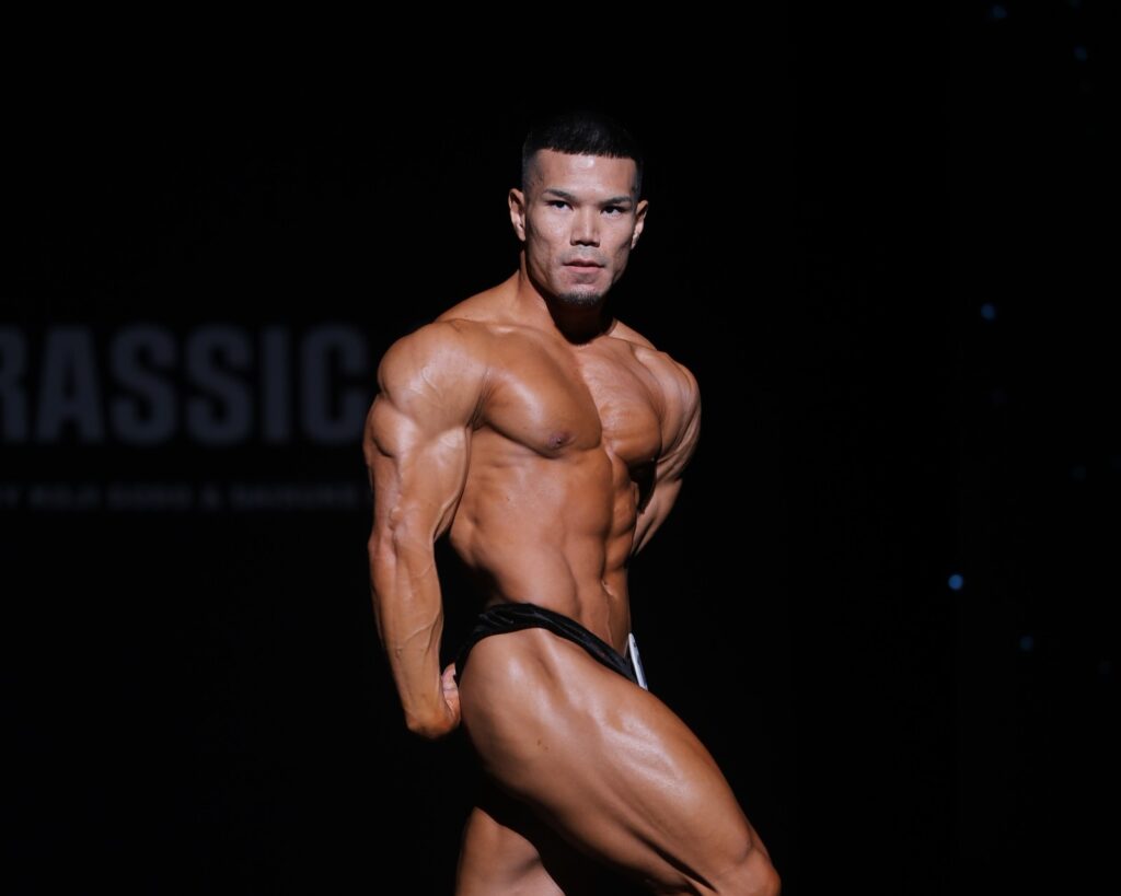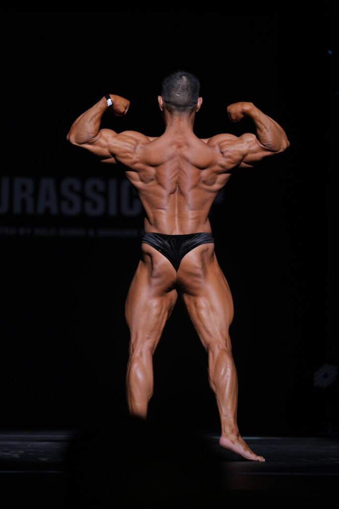 そんな彼の特徴は、弱点部位の存在しない肉体と強烈なバックポーズです。大胸筋、三角筋、上腕など、どこを見ても十分なサイズと質感を獲得しており、体の癖が少ない選手であることがわかります。下半身においても、長い大腿四頭筋の筋腹、しっかり埋まった内転筋が目を引き、上体と同様のバランスを形成しています。中でも、背中の凹凸感とバキバキのハムケツが織りなすバックダブルバイは、一際主張が強く、彼の中でもアピールポイントになっているように思います。