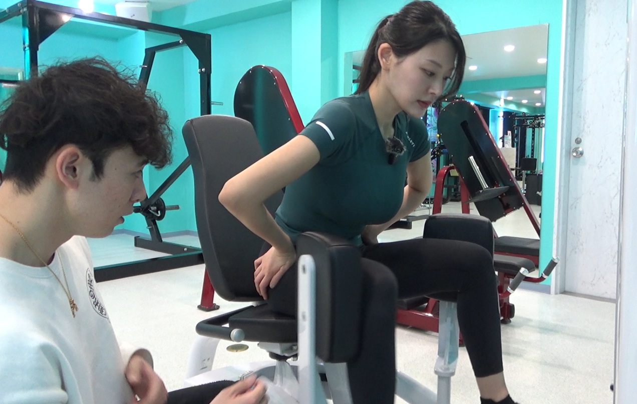 ふたたびヒップアブダクションに戻り、今度は中殿筋の下部を意識していく。追い込みの局面に入り、きつさに悶絶する風吹さん。「自分に負けない。(ここでがんばらないと)グラマラス負けるよ」と染谷トレーナーから檄が飛ぶと、「負けたくない!」と口にして意地でセットをやり切った。